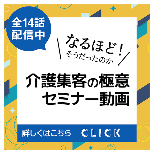 「デイサービス集客のヒントが見つかる!」と話題の”介護集客セミナー動画(90分)”をプレゼント!さらに、完全書き下ろしの”集客レポート(14,000文字)”も無料配布中です。デイサービスや介護施設の集客力アップに役立つヒントが盛りだくさんの内容です。ぜひこの機会にセミナー動画&レポートをGETしてください。