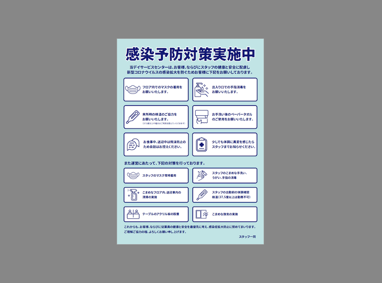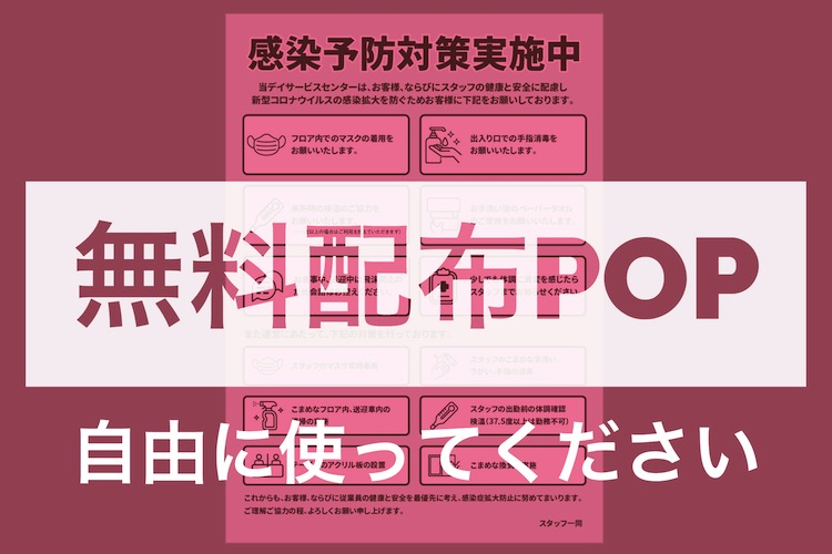 先日、クライアント先のデイサービスとオンライン会議をしている中で「感染予防対策実施中のPOPを作ろうよ」という話になりました。